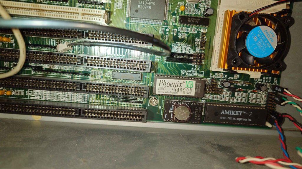 AMD 486 DX2 66MHz with 16MB RAM. Just needs a little bit of cleaning where the old CMOS battery was located, and a new replacement or external battery and it’ll be good to go!