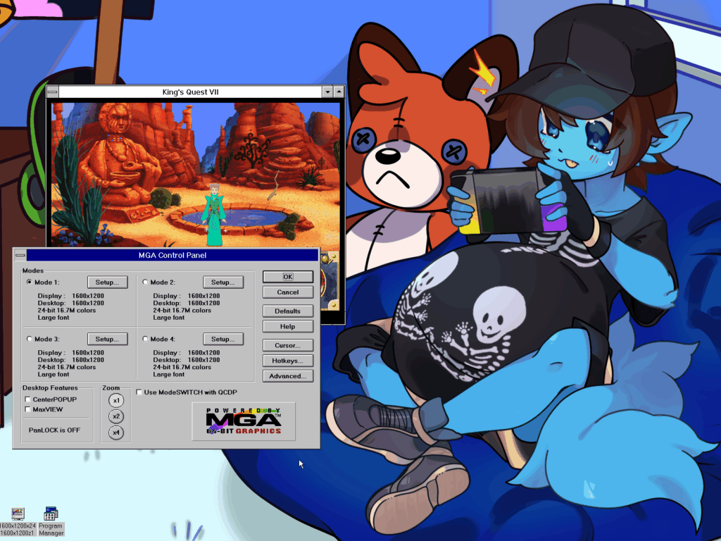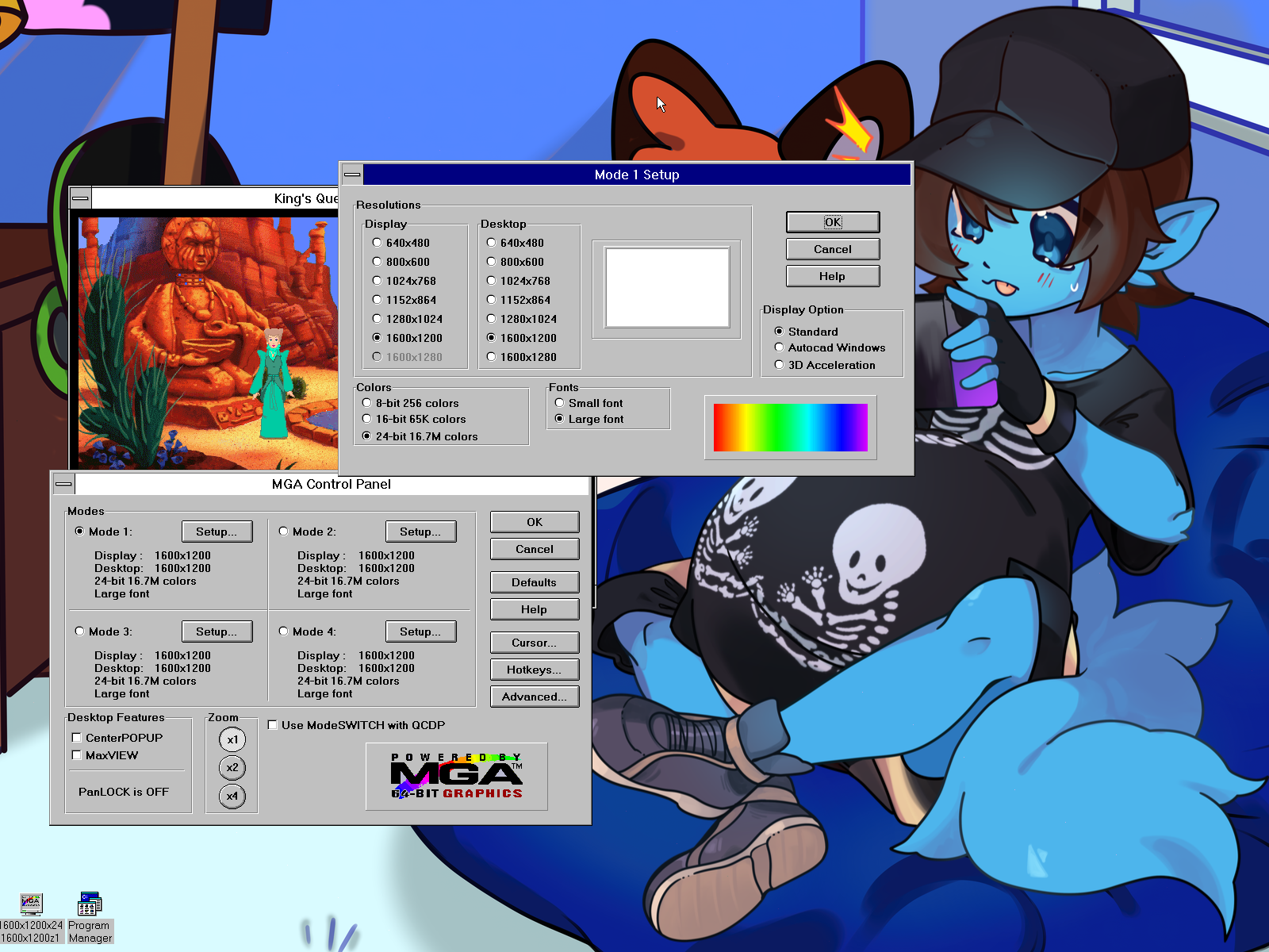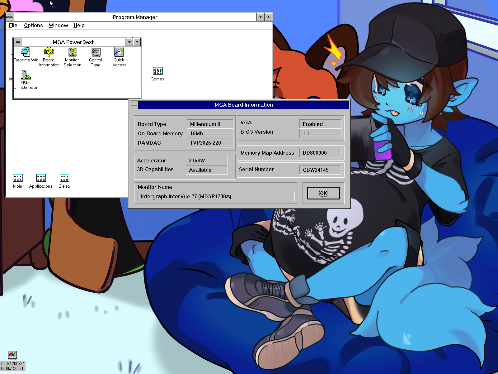 Specifically, I’ve chosen the Matrox MGA Millennium II, with the legacy drivers Matrox still provides, thankfully. Which gives me 1600×1200 with the 24-bit 16.7M true color mode. Sweet!