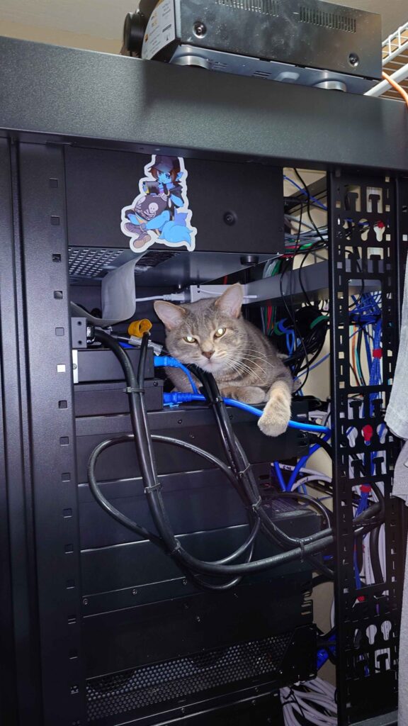 Here in 2025, things are going okay, though, as my silver tabby wants to blend in with the amp rack in my home theater rack sometimes: